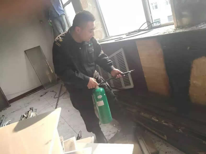 11月7日上午,得安物管二大隊駐某單位保安員正在巡邏時,忽然發(fā)現(xiàn)辦公樓4樓窗戶內(nèi)有火苗竄出。保安員立即啟動應(yīng)急預(yù)案,將具體情況匯報客戶單位及大隊領(lǐng)導(dǎo),同時取來樓道滅火器趕往現(xiàn)場。到達(dá)4樓后,房門緊鎖、屋內(nèi)沒人,在將門打開后,此時屋內(nèi)已經(jīng)是濃煙四起,電腦、打印機等各種辦公設(shè)備均已起火燃燒,情況緊急,保安員立即實施滅火撲救,由于辦公設(shè)備多,蔓延較快,大約用了8分鐘終于將火撲滅,將損失降低到了較低。