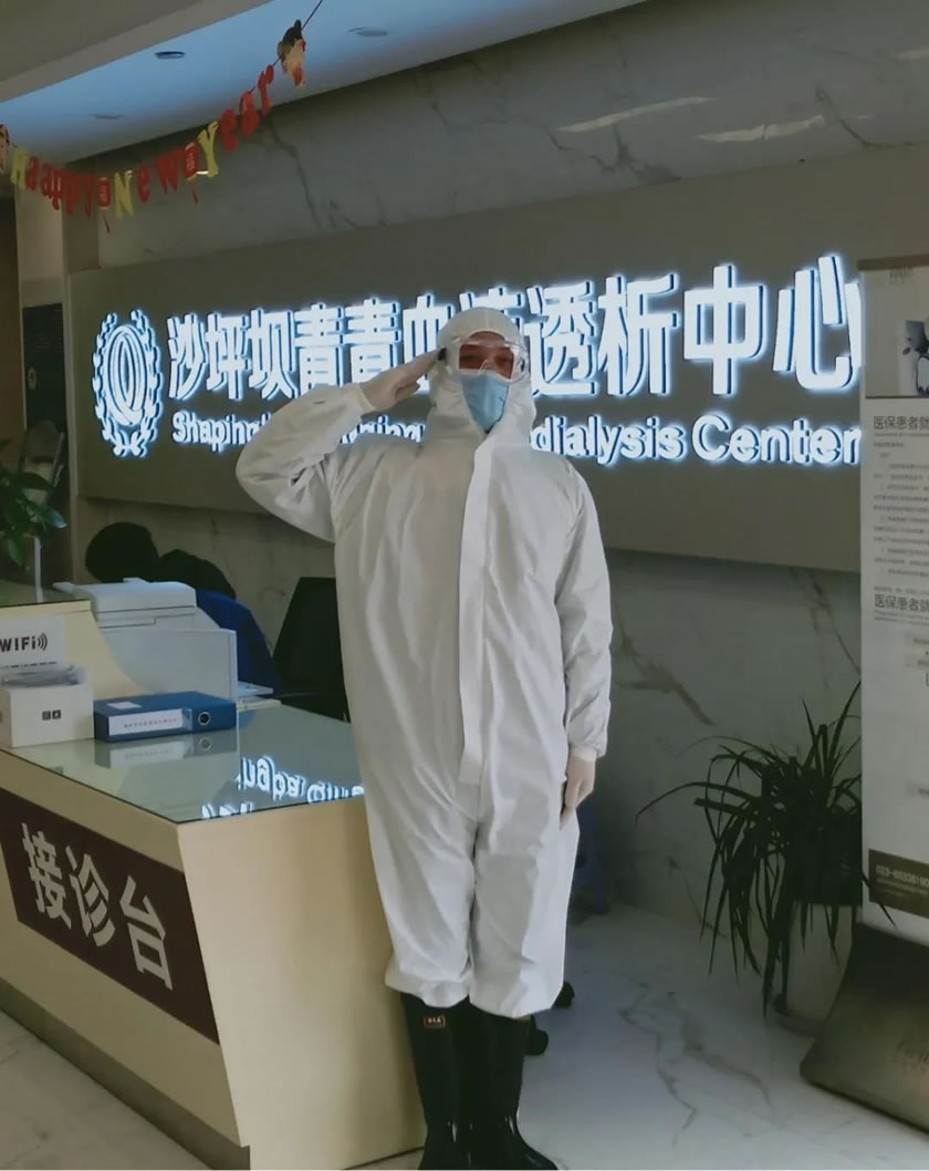 “其實(shí)從穿上防護(hù)服的那一刻,就已經(jīng)是缺氧狀態(tài)了。剛穿上就已經(jīng)汗流浹背,沒(méi)過(guò)多久身上的衣服就濕透了,一會(huì)兒被身體烘干,一會(huì)兒又被汗水打濕,頭發(fā)全是濕的,戴著手套,手心全是汗。”中威保駐青青血液透析中心的保安隊(duì)員王建軍說(shuō)道。