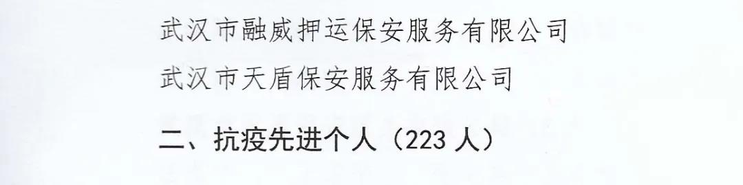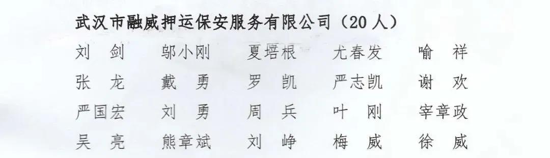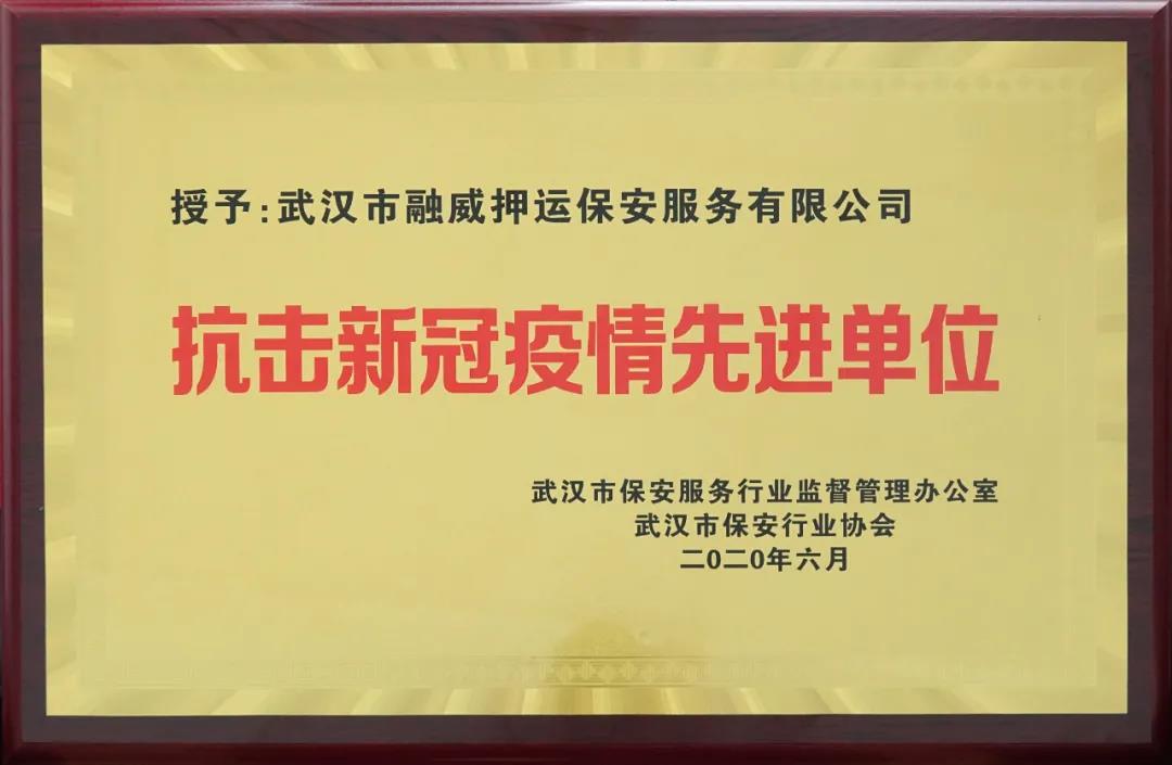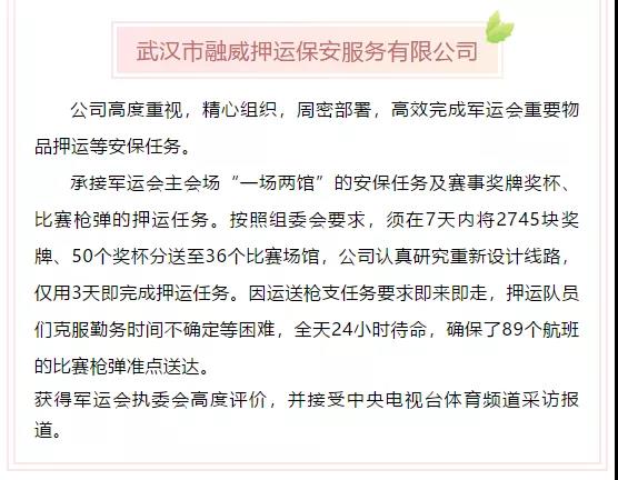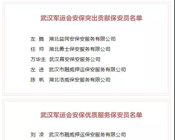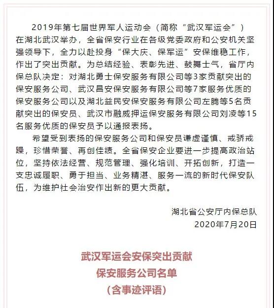 2020年7月20日,湖北省公安廳內(nèi)??傟?duì)發(fā)布了《關(guān)于對(duì)武漢軍運(yùn)會(huì)安保工作作出突出貢獻(xiàn)的保安服務(wù)公司和保安員予以表?yè)P(yáng)的通報(bào)》,武漢市融威押運(yùn)保安服務(wù)有限公司榮獲"武漢軍運(yùn)會(huì)安保突出貢獻(xiàn)保安服務(wù)公司"稱(chēng)號(hào),漢口分公司經(jīng)理左進(jìn)榮獲"武漢軍運(yùn)會(huì)安保突出貢獻(xiàn)保安員"稱(chēng)號(hào),特衛(wèi)犬業(yè)公司副總經(jīng)理劉凌榮獲"武漢軍運(yùn)會(huì)安保優(yōu)質(zhì)服務(wù)保安員"稱(chēng)號(hào)。