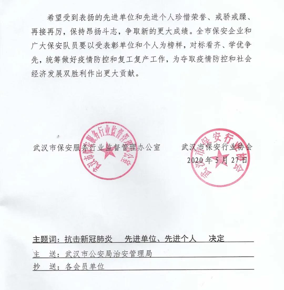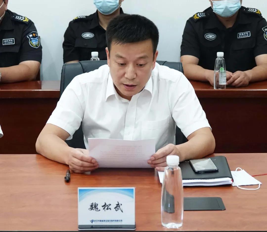 會(huì)上,公司黨委委員、黨辦主任魏松武宣讀了省廳內(nèi)保總隊(duì)《關(guān)于對(duì)武漢軍運(yùn)會(huì)安保工作作出突出貢獻(xiàn)的保安服務(wù)公司和保安員予以表?yè)P(yáng)的通報(bào)》和武漢市保安行業(yè)協(xié)會(huì)《關(guān)于表彰抗擊新冠肺炎疫情防控工作先進(jìn)單位和個(gè)人的決定》。